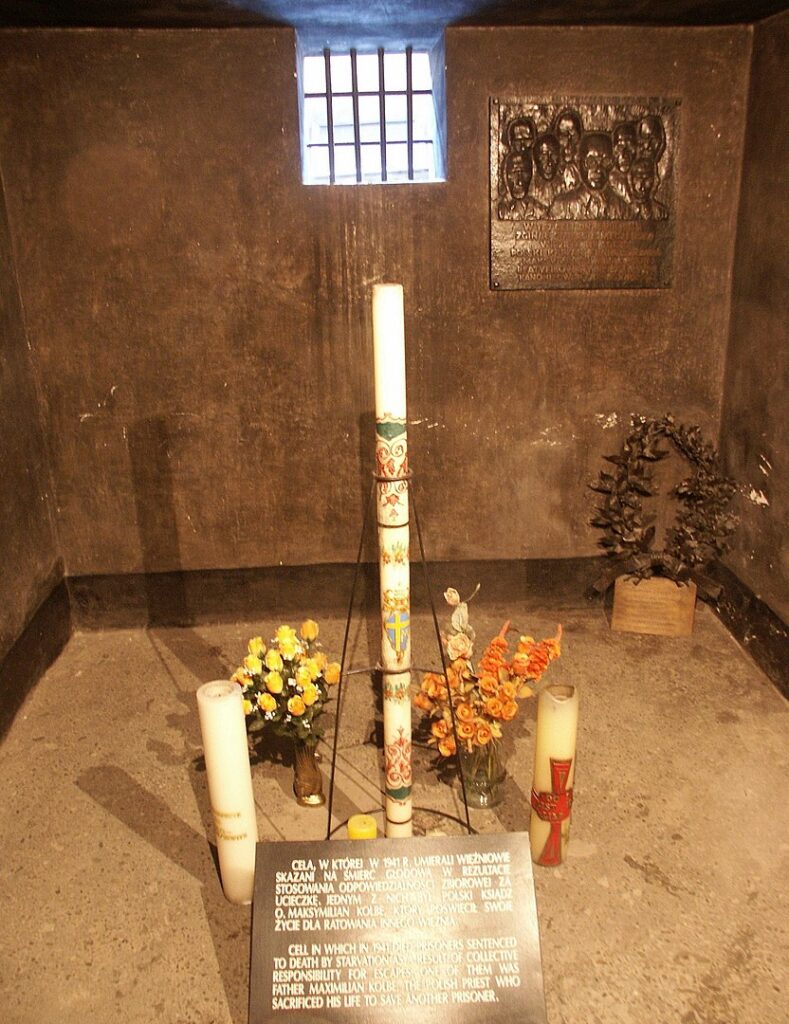 Serliga væl mintist eg søguna um prestin Kolbe, sum bjóðaði seg fram at taka revsing fyri ein annan. Revsingin var at svølta í hel í einum kjallara í einum av húsunum í Auschwitz. Vit vóru í hesum kjallaranum, sum heild sera óunniligur, men ein minnisklivi var gjørdur um prestin Kolbe, og hesin lýsti í myrkrinum heilt aftur til skúlabeinkin í sekstiárunum í Havn.
