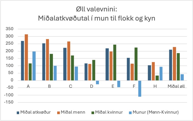 Vit síggja í valúrslitunum frá løgtingsvalinum 2026, at kvinnur fáa færri atkvøður enn menn. Í miðal fáa kvinnur 186 atkvøður, meðan menn fáa 226 atkvøður. Hesin munur ger, at fleiri menn enn kvinnur verða valdir. Av 99 uppstillaðum monnum vórðu 23 valdir, ella 23%, meðan av 61 uppstillaðum kvinnum vórðu 10 valdar, ella 16%.