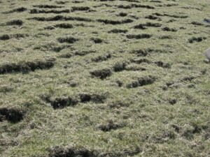 A visible example of this is a story in the Faroese popular science magasin “Frøði” (nr. 2, 2013), where the botanist Anna Maria Fosaa writes about a study from an enclosure, that when established was quite eroded by overgrazing. After a period of 10 years the eroded areas inside the enclosure are deminished 10% compared with the area outside the fence. Hence we can expect it to take a long time before the sward is whole again.